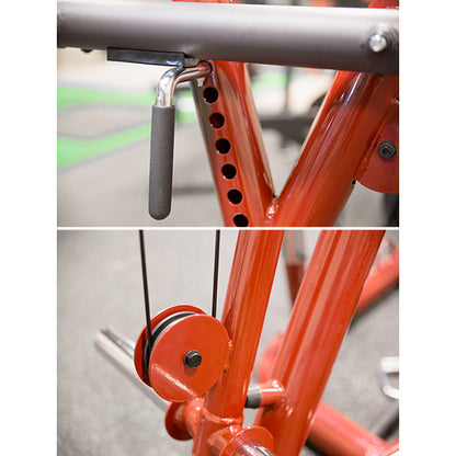 An adjustable knee lock-down makes lat pulldowns easier than ever while the low pulley station is perfect for curls and multiple row exercises. Attached weight horns make weight storage easy.