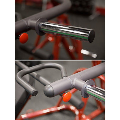 The swing arm/press arm station has a large radius to greater simulate a straight up and down motion. The press arm bar can also be raised to its highest position allowing the GLGS100 to be used as a pull-up/chin-up station.