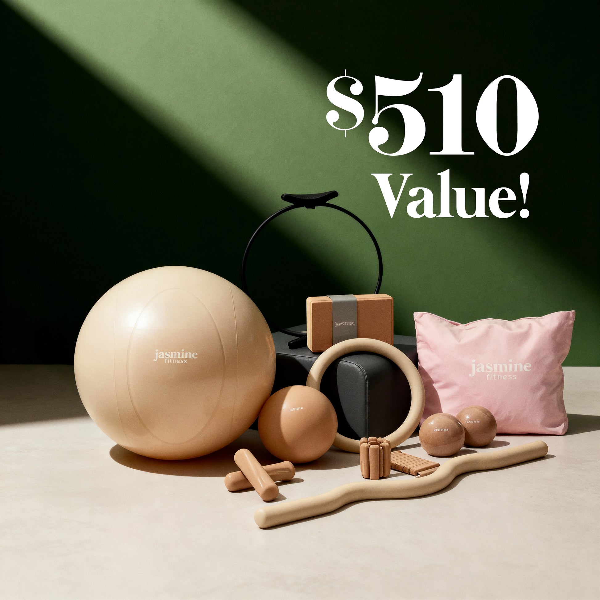 The Jasmine Fitness Pilates Clay Ultimate Kit is a curated bundle of studio-quality pieces designed to build strength, alignment, and mindful movement in one place. This Pilates and yoga set is built for versatility—whether you’re deepening your mat practice, adding resistance to daily movement, or creating a more intentional home studio. Every piece works together so you can move better, feel stronger, and enjoy the value of a full-body training system in a single, thoughtfully priced bundle.