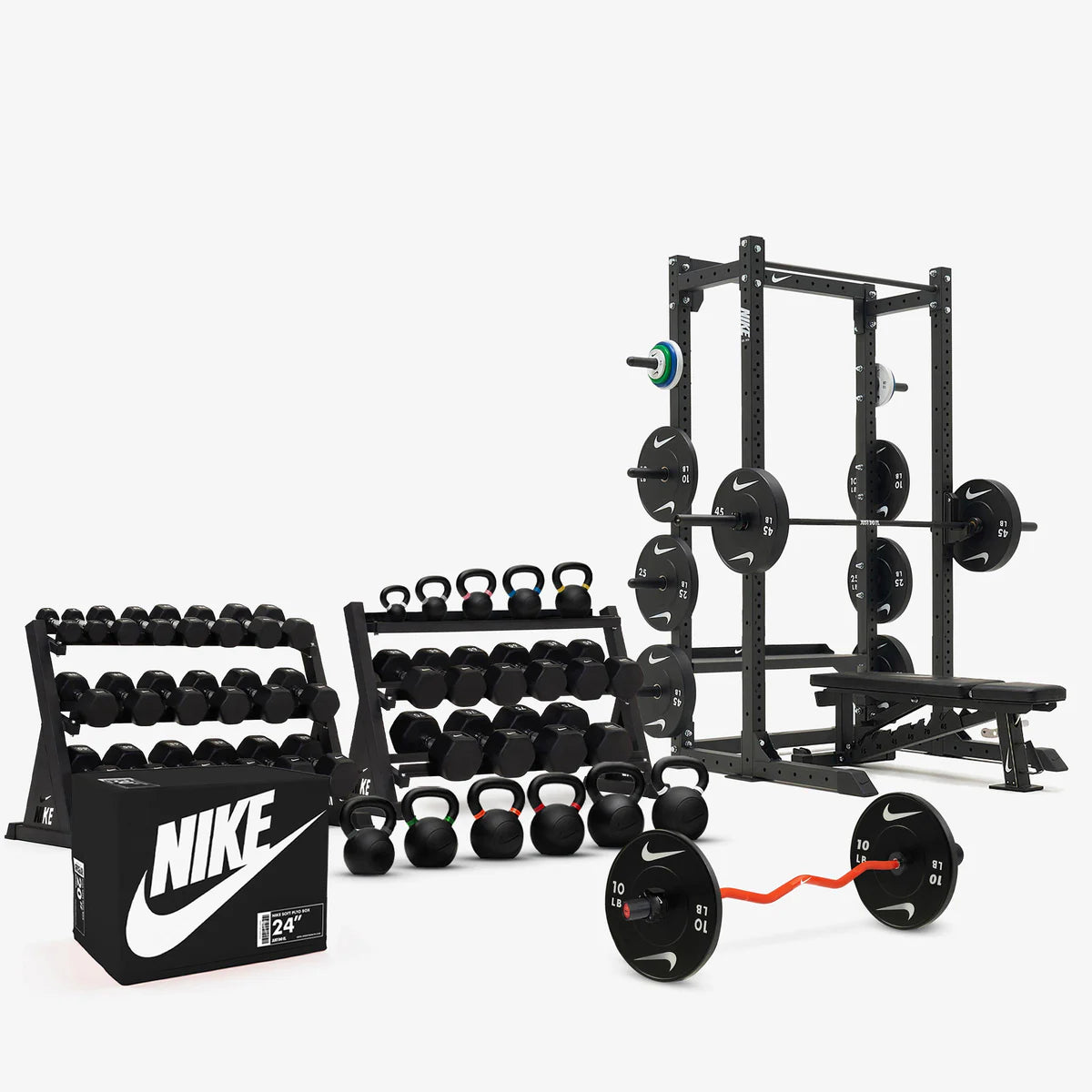 The Nike Half Rack delivers a complete training hub in a compact footprint. Built from 11-gauge steel with competition-grade precision, it pairs long-term durability with daily performance. Features include a pull-up bar, Premium J-cups for bar protection, and integrated weight horns to keep plates organized and always within reach.